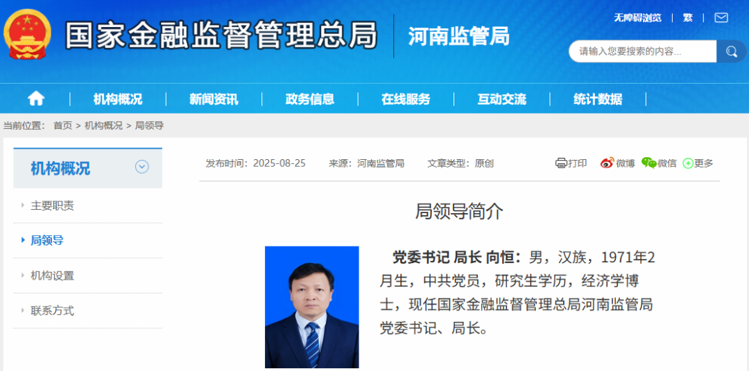 8月26日,国家金融监督管理总局河南监管局网站显示,向恒已任党委书记、局长。