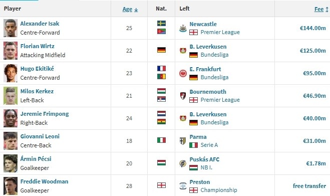 在球员转会身价榜上,英超更是实现了强势霸榜。利物浦完成了两笔亿元级别的交易,切尔西和曼联更新锋线的花费都超过了2亿欧元,阿森纳用同样的资金升级了中轴线,纽卡斯尔将出售伊萨克所得的收入全部用来补强,热刺得到了两位6000万欧元级别的球星。