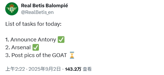 09月02日讯 北京时间今天凌晨,西甲皇家贝蒂斯官宣了安东尼的转会,贝蒂斯官方英文社媒在发布安东尼的相关动态时,还不忘调侃阿森纳。贝蒂斯官推在一则帖文中写道:今天的任务列表:1. 官宣安东尼✅2. 阿森纳✅3. 发布GOAT的图片⌛